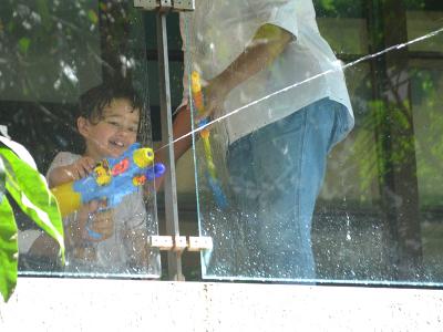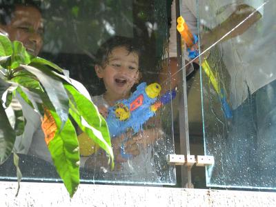 इस दौरान तैमूर के हाथ में पिचकारी थी