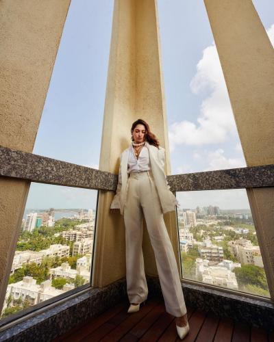 इन तस्वीरों में तमन्ना भाटिया ऑफ व्हाइट शेड का ब्लेजर और ट्राउजर पहना हुआ है, जिसको उन्होंने व्हाइट शर्ट के साथ पेयरअप किया हैं। (फोटो: इंस्टाग्राम)