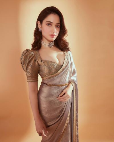 इन तस्वीरों में तमन्ना गोल्डन साड़ी पहने नजर आ रही हैं और इसके साथ उन्होंने डीपनेक ब्लाउज पहने देखा जा सकता हैं। (फोटो: इंस्टाग्राम)