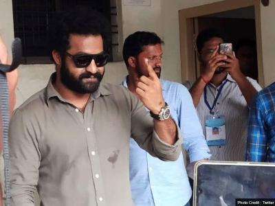 सुपर स्टार जूनियर एनटीआर ने मत डालकर बाहर कारण अपने सियाही दिखाई और बताया कि उन्होंने अपने मत का प्रयोग किया है