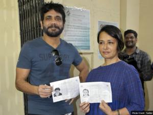 1 / 8तेलंगाना विधानसभा चुनाव 2018 के लिए 119 सीटों के लिए वोटिंग जारी है। सुपरस्टार अक्किनेनी नागार्जुन भी कतार में खड़े दिखाई दिए। वे अपनी पत्नी अमला अक्किनेनी के साथ वोट डालने पहुंचे। 2 / 8नागार्जुन यहां अपनी पत्नी के साथ वोट डालने पहुंचे थे3 / 8जूनियर एनटीआर भी लाइन में लगकर यहां अपना मत का प्रयोग करते नजर आए4 / 8सुपर स्टार जूनियर एनटीआर ने मत डालकर बाहर कारण अपने सियाही दिखाई और बताया कि उन्होंने अपने मत का प्रयोग किया है5 / 8साउथ के सुपरस्टार अल्लू अर्जुन भी अपने मत का प्रयोग करने पोलिंग स्टेशन पहुंचे।6 / 8 अल्लू अर्जुन ने लाइन में लगकर वोट डाला है7 / 8तेलुगू सुपरस्टार चिरंजीवी ने भी मत का प्रयोग किया। उन्होंने भी लाइन में लगकर अपनी पत्नी के साथ वोट डाला है8 / 8बाहुबली फिल्म के निर्देशक राजामौली ने भी अपना वोट डाला है, उन्होंने ट्वीट करके अपनी फोटो पोस्ट की है