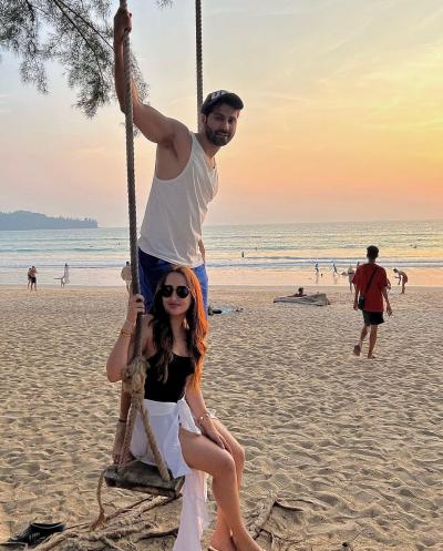 अगली तस्वीर में वरुण धवन समंदर किनार बीच पर पत्नी नताशा के साथ झूले पर मस्ती करते दिख रहे हैं। (फोटो: इंस्टाग्राम)