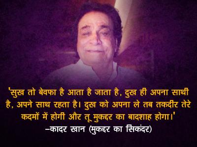 'सुख तो बेवफा है आता है जाता है, दुख ही अपना साथी है, अपने साथ रहता है। दुख को अपना ले तब तकदीर तेरे कदमों में होगी और तू मुकद्दर का बादशाह होगा।' -कादर खान (मुकद्दर का सिकंदर)