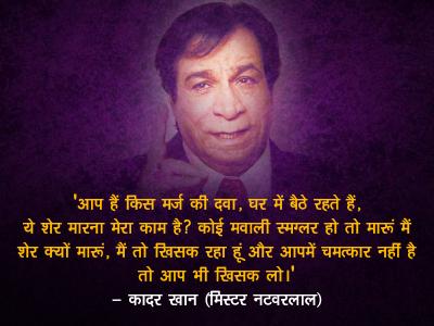 'आप हैं किस मर्ज की दवा, घर में बैठे रहते हैं, ये शेर मारना मेरा काम है? कोई मवाली स्मग्लर हो तो मारूं मैं शेर क्यों मारूं, मैं तो खिसक रहा हूं और आपमें चमत्कार नहीं है तो आप भी खिसक लो।' - कादर खान (मिस्टर नटवरलाल)