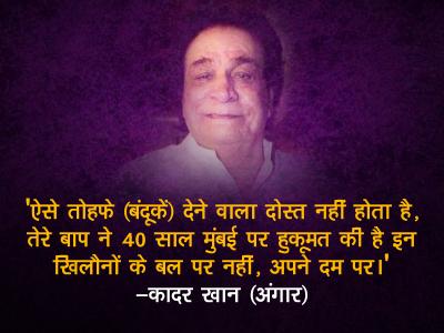 'ऐसे तोहफे (बंदूकें) देने वाला दोस्त नहीं होता है, तेरे बाप ने 40 साल मुंबई पर हुकूमत की है इन खिलौनों के बल पर नहीं, अपने दम पर।' -कादर खान (अंगार)