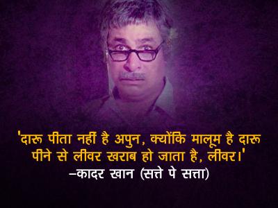 'दारू पीता नहीं है अपुन, क्योंकि मालूम है दारू पीने से लीवर खराब हो जाता है, लीवर।' -कादर खान (सत्ते पे सत्ता)