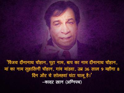 'विजय दीनानाथ चौहान, पूरा नाम, बाप का नाम दीनानाथ चौहान, मां का नाम सुहासिनी चौहान, गांव मांडवा, उम्र 36 साल 9 महीना 8 दिन और ये सोलहवां घंटा चालू है।' -कादर खान (अग्निपथ)