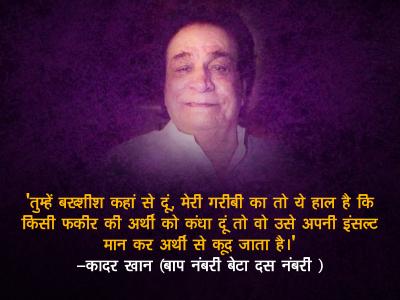 'तुम्हें बख्शीश कहां से दूं, मेरी गरीबी का तो ये हाल है कि किसी फकीर की अर्थी को कंधा दूं तो वो उसे अपनी इंसल्ट मान कर अर्थी से कूद जाता है।' -कादर खान (बाप नंबरी बेटा दस नंबरी )