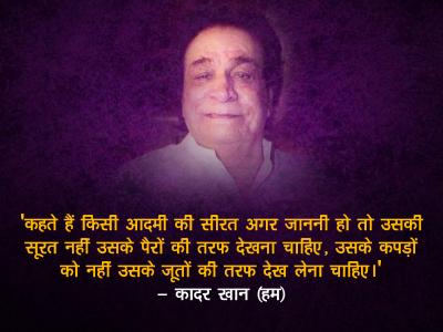 'कहते हैं किसी आदमी की सीरत अगर जाननी हो तो उसकी सूरत नहीं उसके पैरों की तरफ देखना चाहिए, उसके कपड़ों को नहीं उसके जूतों की तरफ देख लेना चाहिए।' - कादर खान (हम)