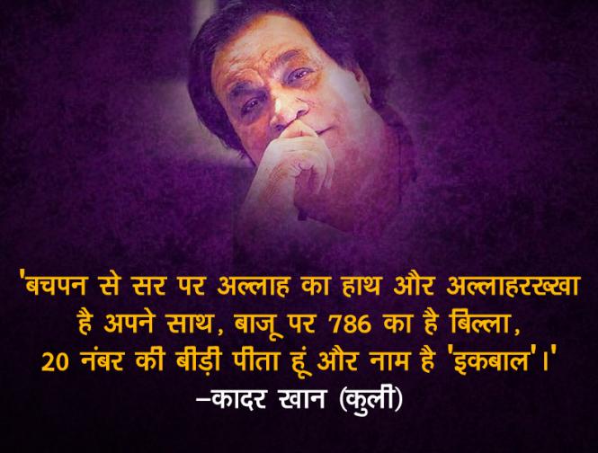 बचपन से सर पर अल्लाह का हाथ और अल्लाहरख्खा है अपने साथ, बाजू पर 786 का है बिल्ला, 20 नंबर की बीड़ी पीता हूं और नाम है 'इकबाल'।' -कादर खान (कुली)