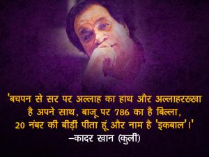 1 / 9बचपन से सर पर अल्लाह का हाथ और अल्लाहरख्खा है अपने साथ, बाजू पर 786 का है बिल्ला, 20 नंबर की बीड़ी पीता हूं और नाम है 'इकबाल'।' -कादर खान (कुली) 2 / 9'सुख तो बेवफा है आता है जाता है, दुख ही अपना साथी है, अपने साथ रहता है। दुख को अपना ले तब तकदीर तेरे कदमों में होगी और तू मुकद्दर का बादशाह होगा।' -कादर खान (मुकद्दर का सिकंदर)3 / 9'मालिक मुझे नहीं पता था कि बंदूक लगाए आप मेरे पीछे खड़े हैं। मुझे लगा, मुझे लगा कि कोई जानवर अपने सींग से मेरे पीछे खटबल्लू बना रहा है।' - कादर खान (हिम्मतवाला) 4 / 9'आप हैं किस मर्ज की दवा, घर में बैठे रहते हैं, ये शेर मारना मेरा काम है? कोई मवाली स्मग्लर हो तो मारूं मैं शेर क्यों मारूं, मैं तो खिसक रहा हूं और आपमें चमत्कार नहीं है तो आप भी खिसक लो।' - कादर खान (मिस्टर नटवरलाल) 5 / 9'ऐसे तोहफे (बंदूकें) देने वाला दोस्त नहीं होता है, तेरे बाप ने 40 साल मुंबई पर हुकूमत की है इन खिलौनों के बल पर नहीं, अपने दम पर।' -कादर खान (अंगार)6 / 9'दारू पीता नहीं है अपुन, क्योंकि मालूम है दारू पीने से लीवर खराब हो जाता है, लीवर।' -कादर खान (सत्ते पे सत्ता)7 / 9'विजय दीनानाथ चौहान, पूरा नाम, बाप का नाम दीनानाथ चौहान, मां का नाम सुहासिनी चौहान, गांव मांडवा, उम्र 36 साल 9 महीना 8 दिन और ये सोलहवां घंटा चालू है।' -कादर खान (अग्निपथ)8 / 9'तुम्हें बख्शीश कहां से दूं, मेरी गरीबी का तो ये हाल है कि किसी फकीर की अर्थी को कंधा दूं तो वो उसे अपनी इंसल्ट मान कर अर्थी से कूद जाता है।' -कादर खान (बाप नंबरी बेटा दस नंबरी )9 / 9'कहते हैं किसी आदमी की सीरत अगर जाननी हो तो उसकी सूरत नहीं उसके पैरों की तरफ देखना चाहिए, उसके कपड़ों को नहीं उसके जूतों की तरफ देख लेना चाहिए।' - कादर खान (हम)