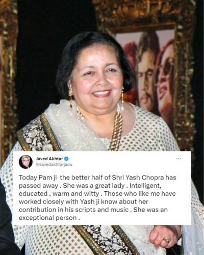 गीतकार जावेद अख्तर ने पामेला चोपड़ा के निधन पर ट्वीट करते हुए लिखा, "आज श्री यश चोपड़ा की अर्धांगिनी पामेला जी का निधन हो गया है। वह एक महान महिला थीं। बुद्धिमान, शिक्षित, गर्म और मजाकिया। मेरे जैसे लोग जिन्होंने यश जी के साथ मिलकर काम किया है, वे उनकी पटकथा और संगीत में उनके योगदान के बारे में जानते हैं। वह एक असाधारण व्यक्ति थीं।" (फोटो: ट्विटर)