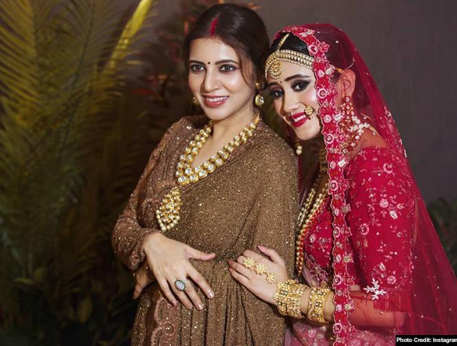 इस लाल रंग के लहंगे में शिवांगी ने गोल्डन ज्वैलरी कैरी की हुई है।