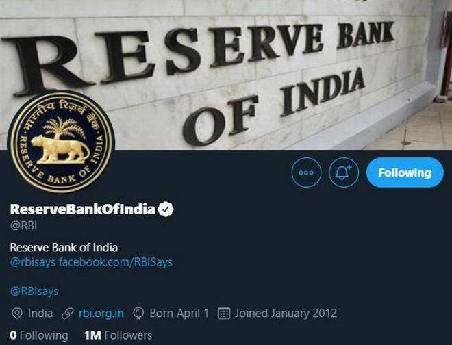 भारतीय रिजर्व बैंक के ट्विटर पर ‘फालोअर्स’ की संख्या 10 लाख को पार कर गई है। यह उपलब्धि हासिल करने वाला रिजर्व बैंक दुनिया का पहला मौद्रिक प्राधिकरण हो गया है।
