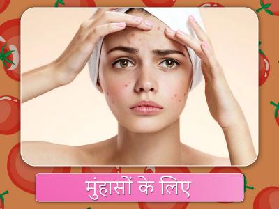 मुंहासों के होने पर चेहरे पर टमाटर का पेस्ट लगाएं और इस एकं से कम 20 मिनट के लिए लगा रहने दें। अंत में ठंडे पानी से धो लें। मात्
