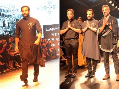 सैफ अली खान रैंप पर काले स्टाइलिश कुर्ते में दिखाई दिए।