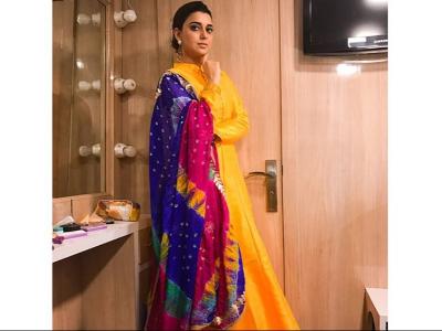 सरगुन का पहना ये सूट सिंपल लेकिन सुंदर है। लोहड़ी के हिसाब से ये परफेक्ट कलर बन सकता है। आप भी ट्राई करें।