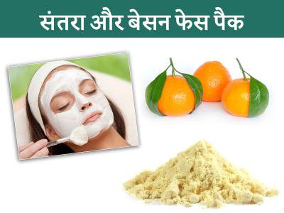 5) संतरा और बेसन फेस पैक: 2 चम्मच बेसन, 3 चम्मच संतरे का गूदा और गुलाब जल (जितना दोनों चीजों को मिलाने में इस्तेमाल हो), इन तीनों चीजों को अच्छी तरह मिला लें। मिलाने पर हल्का गाढ़ा पेस्ट तैयार करें। इसे चेहरे पर लगाएं। सूखने पर ठंडे पानी से चेहरा धो लें। फेस पैक में मौजूद संतरा और बेसन दोनों ही त्वचा पर जमा ऑइल और धूल-मिट्टी से छुटकारा दिलाते हैं।