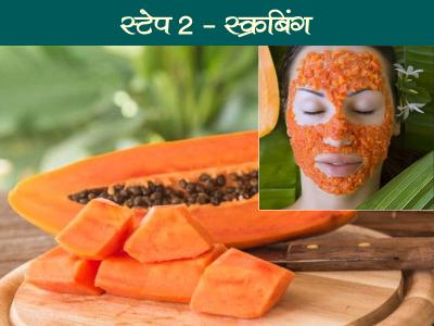 स्टेप 2 - स्क्रबिंग: यहां आपको पपीते और ओट्स से स्क्रब बनाना है। पपीते का पल्प तैयार कर लें। इसमें ओट्स और आटा मिक्स करके स्क्रब बना लें। इस स्क्रब से चेहरे पर 4 से 5 मिनट हलके हाथों से मसाज करें। मसाज के बाद पेस्ट को चेहरे पर 2 मिनट लगा रहने दें और फिर टिश्यू पेपर को पानी में भिगोकर चेहरा साफ कर लें