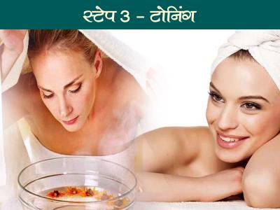 स्टेप 3 - टोनिंग: एक पैन में पानी और ग्रीन टी के 3 बैग डालकर पानी को अच्छी तरह उबाल लें। इस उबले हुए पानी से चेहरे को भाप दें। कम से कम 5 मिनट तक भाप दें। ऐसा करने से चेहरे के पोर्स खुल जायेंगे। अब आप ब्लैकहेड्स निकाल सकती हैं। ध्यान रहे ब्लैकहेड्स निकालते समय स्किन के साथ अधिक जबरदस्ती ना करें। जितना मुमकिन हो उतना ही साफ करें।