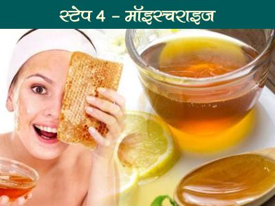 स्टेप 4 - मॉइस्चराइज: अब शहद लेकर हलके हाथों से चेहरे पर मसाज करें। यह जेल की तरह काम करेगा, 2 मिनट तक मसाज करने के बाद इसी जेल के ऊपर पहले जैतून का तेल और फिर बादाम का तेल एक एक करके लगाएं और साथ ही मसाज करते रहें। मसाज देने के बाद गीले टिश्यू पेपर से चेहरा साफ कर लें।