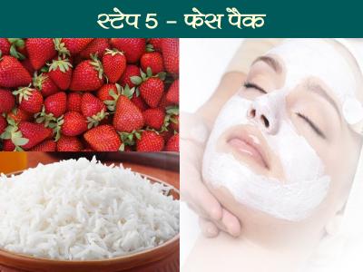 स्टेप 5 - फेस पैक: अब अंत में चेहरा साफ करने के बाद चेहरे पर फेस पैक लगाएं। फेस पैक बनाने के लिए मिक्सर ग्राइंडर में स्ट्रॉबेरी, चावल का आता, शहद ब्लेंड कर लें। इन सभी को मिलाने के बाद तैयार हुए पेस्ट को चेहरे पर तकरीबन 15 मिनट लगाकर रखें। इस पेस्ट में डाली गई स्ट्रॉबेरी से चेहरे को गुलाबी रंग मिलेगा और चावल तथा शहद चेहरे की डार्क स्किन को लाइट करने का काम करेगा।