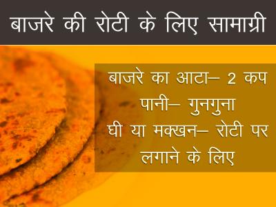 बाजरे की रोटी के लिए सामाग्री: बाजरे का आटा- 2 कप, पानी- गुनगुना, घी या मक्खन- रोटी पर लगाने के लिए