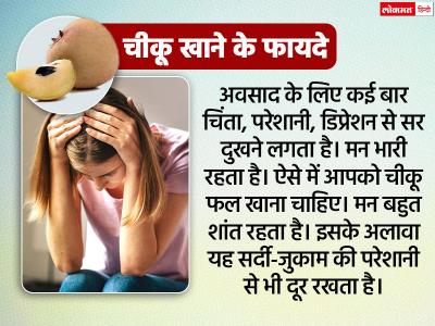 अवसाद के लिए कई बार चिंता, परेशानी, डिप्रेशन से सर दुखने लगता है। मन भारी रहता है। ऐसे में आपको चीकू फल खाना चाहिए। मन बहुत शांत रहता है। इसके अलावा यह सर्दी-जुकाम की परेशानी से भी दूर रखता है।