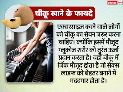 एक्सरसाइज करने वाले लोगों को चीकू का सेवन जरूर करना चाहिए। क्योंकि इसमें मौजूद ग्लूकोज शरीर को तुरंत ऊर्जा प्रदान करता है। वहीं चीकू में जिंक मौजूद होता है जो सेक्स लाइफ को बेहतर बनाने में मददगार होता है।