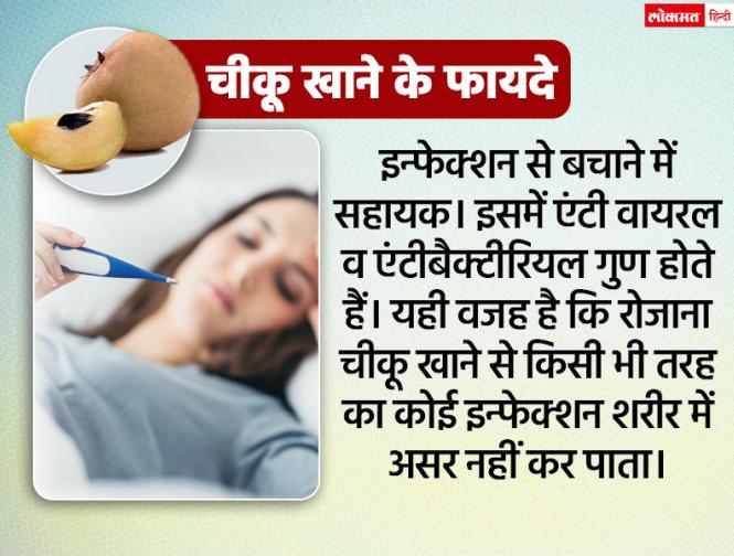 इन्फेक्शन से बचाने में सहायक। इसमें एंटी वायरल व एंटीबैक्टीरियल गुण होते हैं। यही वजह है कि रोजाना चीकू खाने से किसी भी तरह का कोई इन्फेक्शन शरीर में असर नहीं कर पाता।
