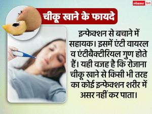 1 / 10इन्फेक्शन से बचाने में सहायक। इसमें एंटी वायरल व एंटीबैक्टीरियल गुण होते हैं। यही वजह है कि रोजाना चीकू खाने से किसी भी तरह का कोई इन्फेक्शन शरीर में असर नहीं कर पाता।2 / 10चीकू में खनिज लवण प्रचुर मात्रा में पाए जाते हैं। जिससे हमारे शरीर की इम्युनिटी बढ़ती है। जिससे कई रोगों से लड़ने में हमारे शरीर को मदद मिलता है।3 / 10चीकू फल में फाइबर प्रचुर मात्रा में पाया जाता है। इसलिए यह पाचन तंत्र के लिए भी किसी वरदान से कम नहीं है। इसके सेवन से हमारी पाचन क्रिया स्वस्थ बनी रहती है।4 / 10चीकू फल का सेवन करने से वजन कम करने में मदद मिलती है।5 / 10चीकू में कैल्शियम मौजूद होते हैं जो हड्डियों को मजबूत बनाते हैं। इसलिए बड़े बुजुर्गों को चीकू का जरूर सेवन करना चाहिए।6 / 10चीकू फल में विटामिन ए प्रचुर मात्रा में पाया जाता है जो आंखों की समस्याओं को दूर करने में मदद करता है।7 / 10चीकू फल मूत्र वर्धक के रूप में भी काम करता है, जिसके कारण पेशाब के रास्ते शरीर के विषाक्त तत्वों को बाहर निकालने में मददगार होता है।8 / 10चीकू फल के बीज को पीसकर सेवन करने से गुर्दे की पथरी पेशाब के रास्ते बाहर निकल जाती है।9 / 10एक्सरसाइज करने वाले लोगों को चीकू का सेवन जरूर करना चाहिए। क्योंकि इसमें मौजूद ग्लूकोज शरीर को तुरंत ऊर्जा प्रदान करता है। वहीं चीकू में जिंक मौजूद होता है जो सेक्स लाइफ को बेहतर बनाने में मददगार होता है।10 / 10अवसाद के लिए कई बार चिंता, परेशानी, डिप्रेशन से सर दुखने लगता है। मन भारी रहता है। ऐसे में आपको चीकू फल खाना चाहिए। मन बहुत शांत रहता है। इसके अलावा यह सर्दी-जुकाम की परेशानी से भी दूर रखता है।