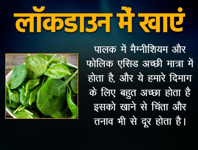 पालक में मैग्नीशियम और फोलिक एसिड अच्छी मात्रा में होता है, और ये हमारे दिमाग के लिए बहुत अच्छा होता है इसको खाने से चिंता और तनाव भी से दूर होता है।