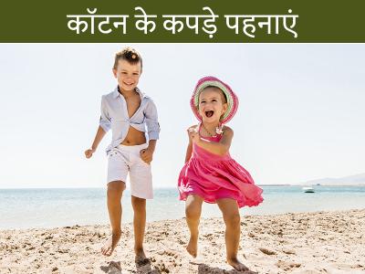 4) कॉटन के कपड़े पहनाएं: पूरी गर्मियां जितना संभव हो सके बच्चों को कॉटन के ही कपड़े पहनाएं। ये पसीनाअस्सानी से सोख लेते हैं और गर्म हवा को सीधा त्वचा पर वार करने से रोकते हैं। सॉफ्ट होने की वजह से त्वचा पर कपड़े की वजह से कोई दिक्कत भी नहीं होती। एक और बात, हलके रंग के कपड़े पहनाएं। इनमें गर्मी कम लगती है।