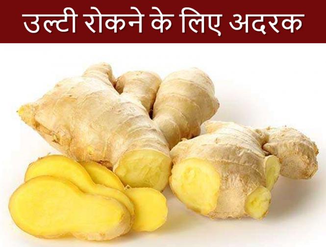 अदरक पाचन तंत्र के लिए बेहतर चीज है। ये नैचुरल एंटी-एमेटिक के जैसे काम करता है जिस वजह से उल्टी रोकने लिए सबसे बेहतर विकल्प है। आप एक चम्मच अदरक रस में नींबू के रस को मिलाकर दिन में दो से तीन बार ले सकते हैं। इससे तुरंत उल्टी से राहत मिलती है। इसके अलावा आप अदरक के छोटे टुकड़े को नमक के साथ खा सकते हैं।