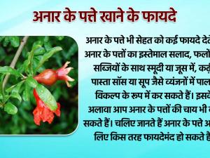 1 / 6अनार के पत्ते भी सेहत को कई फायदे देते हैं। अनार के पत्तों का इस्तेमाल सलाद, फलों और सब्जियों के साथ स्मूदी या जूस में, कढ़ी, पास्ता सॉस या सूप जैसे व्यंजनों में पालक विकल्प के रूप में कर सकते हैं। इसके अलावा आप अनार के पत्तों की चाय भी बना सकते हैं। चलिए जानते हैं अनार के पत्ते आपके लिए किस तरह फायदेमंद हो सकते हैं। 2 / 6गार्डन डॉट इको के अनुसार, एक्जिमा त्वचा की सबसे घातक बीमारी है। इससे ग्रस्त व्यक्ति लगातर खुजली और जलन से परेशान हो जाता है। कई बार तो गंभीर घाव भी हो जाते हैं और शरीर पर लाल चकत्ते पड़ने लगते हैं। यह रोग वंशानुगत रूप से भी होता है।3 / 6आयुर्वेदिक चिकित्सा में, इनका उपयोग भूख बढ़ाने और पाचन समस्याओं के लिए किया जाता है। आजकल खराब जीवनशैली और शारीरिक गतिविधियों के कम होने से बहुत से लोगों को भूख नहीं लगती है जिसकी वजह से वो कम खाते हैं।4 / 6पाचन क्रिया खराब होने पर भोजन पूरी तरह से पचता नहीं है, जिसके कारण शरीर को पर्याप्त पोषण नहीं मिल पाता। इसका मतलब यह है कि यह समस्या कई गंभीर बीमारीयों का कारण बन सकती है।5 / 6नींद से संबंधित परेशानियों में सबसे पहले ज़िक्र होता है अनिद्रा का। भागदौड़ भरी जिंदगी और तनाव के कारण अधिकतर लोग अनिद्रा की समस्या के शिकार हैं। अनिद्रा के कई कारण हो सकते हैं। इसके लक्षणों में रात में सोने में कठिनाई, रात के दौरान जागना, दैनिक कार्यों पर ध्यान केंद्रित करने में समस्या, नींद और थकावट महसूस होना शामिल हैं। इससे बचने के लिए आप अनार के पत्तों की चाय पी सकते हैं। 6 / 6अगर आप ऊपर बताये गए किसी रोग से पीड़ित हैं और उससे राहत पाने के लिए अनार के पत्तों का इस्तेमाल करना चाहते हैं, तो पहले डॉक्टर या एक्सपर्ट से सलाह लें। किसी भी चीज का अधिक सेवन सेहत के लिए हमेशा खतरनाक होता है इसलिए सलाह जरूरी है।