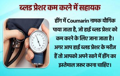 हींग में Coumarin नामक यौगिक पाया जाता है, जो हाई ब्लड प्रेशर को कम करने के लिए जाना जाता है। अगर आप हाई ब्लड प्रेशर के मरीज हैं तो आपको अपने खाने में हींग का इस्तेमाल जरूर करना चाहिए।