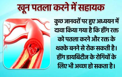 कुछ जानवरों पर हुए अध्ययन में दावा किया गया है कि हींग रक्त को पतला करने और रक्त के थक्के बनने से रोक सकती है। हींग डायबिटीज के रोगियों के लिए भी अच्छा हो सकता है।