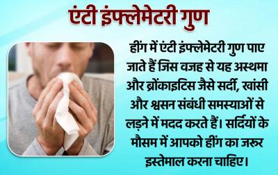 हींग में एंटी इंफ्लेमेटरी गुण पाए जाते हैं जिस वजह से यह अस्थमा और ब्रोंकाइटिस जैसे सर्दी, खांसी और श्वसन संबंधी समस्याओं से लड़ने में मदद करते हैं। सर्दियों के मौसम में आपको हींग का जरूर इस्तेमाल करना चाहिए।