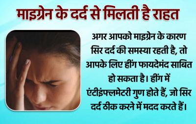 अगर आपको माइग्रेन के कारण सिर दर्द की समस्या रहती है, तो आपके लिए हींग फायदेमंद साबित हो सकता है। हींग में एंटीइंफ्लमेटरी गुण होते हैं, जो सिर दर्द ठीक करने में मदद करते हैं।