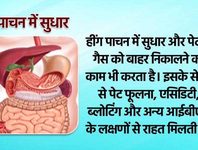 हींग पाचन में सुधार और पेट से गैस को बाहर निकालने का काम भी करता है। इसके सेवन से पेट फूलना, एसिडिटी, ब्लोटिंग और अन्य आईबीएस के लक्षणों से राहत मिलती है।