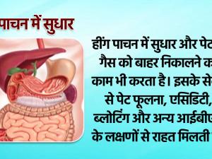 1 / 6हींग पाचन में सुधार और पेट से गैस को बाहर निकालने का काम भी करता है। इसके सेवन से पेट फूलना, एसिडिटी, ब्लोटिंग और अन्य आईबीएस के लक्षणों से राहत मिलती है।2 / 6हींग में Coumarin नामक यौगिक पाया जाता है, जो हाई ब्लड प्रेशर को कम करने के लिए जाना जाता है। अगर आप हाई ब्लड प्रेशर के मरीज हैं तो आपको अपने खाने में हींग का इस्तेमाल जरूर करना चाहिए।3 / 6कुछ जानवरों पर हुए अध्ययन में दावा किया गया है कि हींग रक्त को पतला करने और रक्त के थक्के बनने से रोक सकती है। हींग डायबिटीज के रोगियों के लिए भी अच्छा हो सकता है।4 / 6हींग में एंटी इंफ्लेमेटरी गुण पाए जाते हैं जिस वजह से यह अस्थमा और ब्रोंकाइटिस जैसे सर्दी, खांसी और श्वसन संबंधी समस्याओं से लड़ने में मदद करते हैं। सर्दियों के मौसम में आपको हींग का जरूर इस्तेमाल करना चाहिए। 5 / 6अगर आपको माइग्रेन के कारण सिर दर्द की समस्या रहती है, तो आपके लिए हींग फायदेमंद साबित हो सकता है। हींग में एंटीइंफ्लमेटरी गुण होते हैं, जो सिर दर्द ठीक करने में मदद करते हैं।6 / 6आपको जानकर हैरानी होगी कि हींग डायबिटीज में भी फायदेमंद होता है। अगर आपको डायबिटीज की समस्या है, तो डॉक्टर की सलाह से हींग का सेवन कर सकते हैं।