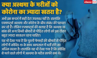 कोरोना वायरस से जंग जीतने के लिए अस्थमा से पीड़ित लोगों को अधिक सावधानी बरतनी चाहिए। कोरोना वायरस फेफड़ों को सबसे ज्यादा प्रभावित करता है और ऐसे में अस्थमा के मरीजों को ज्यादा सतर्क रहें की जरूरत होती है। अगर आपको पहले से ही सांस की कोई बीमारी है तो आप सावधान रहें।