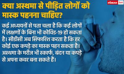 कई अध्ययनों से पता चला है कि कई लोगों में लक्षणों के बिना भी कोविड-19 हो सकता है। सीडीसी अब सिफारिश करता है कि हर कोई एक कपड़े का मास्क पहन सकता है। अस्थमा के मरीज भी स्कार्फ, बंदन या कपड़े से अपना कवर बना सकते हैं।
