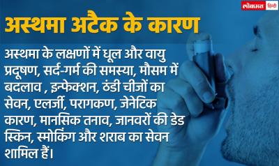 अस्थमा के लक्षणों में धूल और वायु प्रदूषण, सर्द-गर्म की समस्या, मौसम में बदलाव , इन्फेक्शन, ठंडी चीजों का सेवन, एलर्जी, परागकण, जेनेटिक कारण, मानसिक तनाव, जानवरों की डेड स्किन, स्मोकिंग और शराब का सेवन शामिल हैं।