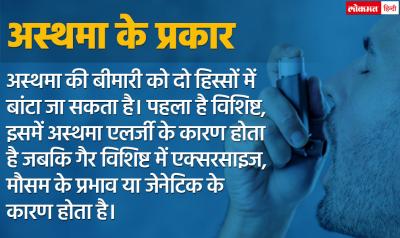 अस्थमा की बीमारी को दो हिस्सों में बांटा जा सकता है। पहला है विशिष्ट, इसमें अस्थमा एलर्जी के कारण होता है जबकि गैर विशिष्ट में एक्सरसाइज, मौसम के प्रभाव या जेनेटिक के कारण होता है।