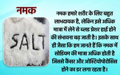 नमक हमारे शरीर के लिए बहुत लाभदायक है, लेकिन इसे अधिक मात्रा में लेने से ब्लड प्रेशर हाई होने की संभावना बढ़ जाती है। इसके साथ ही जैसा कि हम जानते हैं कि नमक में सोडियम की मात्रा अधिक होती है जिससे कैंसर और ओस्टियोपोरोसिस होने का डर लगा रहता है।