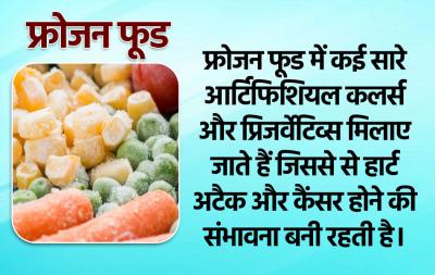 फ्रोजन फूड में कई सारे आर्टिफिशियल कलर्स और प्रिजर्वेटिव्स मिलाए जाते हैं जिससे से हार्ट अटैक और कैंसर होने की संभावना बनी रहती है।