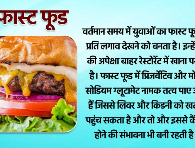 वर्तमान समय में युवाओं का फास्ट फूड के प्रति लगाव देखने को बनता है। इन्हें घर की अपेक्षा बाहर रेस्टोरेंट में खाना पसंद है। फास्ट फूड में प्रिजर्वेटिव और मोनो सोडियम ग्लूटामेट नामक तत्व पाए जाते हैं जिससे लिवर और किडनी को खतरा पहुंच सकता है और तो और इससे कैंसर होने की संभावना भी बनी रहती है।