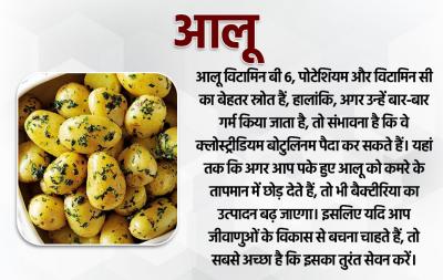 आलू विटामिन बी 6, पोटेशियम और विटामिन सी का बेहतर स्रोत हैं, हालांकि, अगर उन्हें बार-बार गर्म किया जाता है, तो संभावना है कि वे क्लोस्ट्रीडियम बोटुलिनम पैदा कर सकते हैं। यहां तक कि अगर आप पके हुए आलू को कमरे के तापमान में छोड़ देते हैं, तो भी बैक्टीरिया का उत्पादन बढ़ जाएगा। इसलिए यदि आप जीवाणुओं के विकास से बचना चाहते हैं, तो सबसे अच्छा है कि इसका तुरंत सेवन करें।