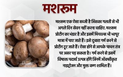 मशरूम एक ऐसा सब्जी है जिसका गलती से भी अगले दिन सेवन नहीं करना चाहिए. मशरूम प्रोटीन का भंडार है और इसमें मिनरल्स भी भरपूर मात्रा में पाए जाते हैं। इसे दुबारा गर्म करने से प्रोटीन टूट जाते हैं। ऐसा होने से आपके पाचन तंत्र पर असर पड़ सकता है। गर्म करने से इसमें विषाक्त पदार्थ उत्पन्न होंगे जिनमें ऑक्सीकृत नाइट्रोजन और मुक्त कण शामिल हैं।